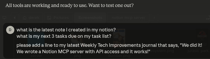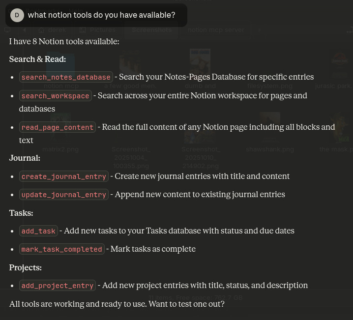 Successfully wrote an MCP server to interact with my Notion Workspace via API, and it has 8 tools.